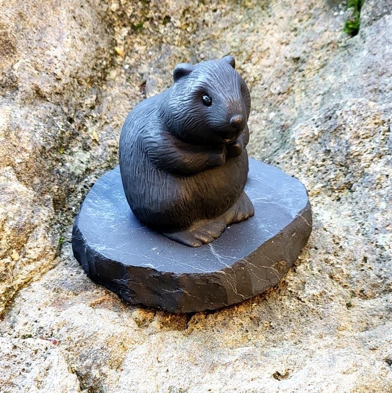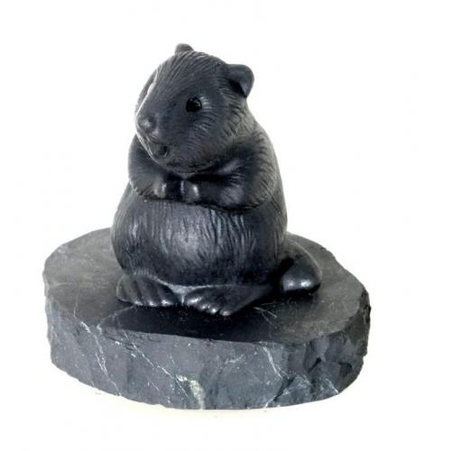 Фигурка изготовлена из шунгитового порошка (70%) с добавлением связующего состава, на подставке из шунгита.